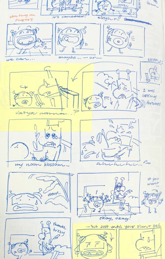 A board I pitched for my 3rd year group film (completed 2021). I was really enamored with the “Moth” design I pitched alongside the base idea for this film– so this scene was boarded in my own time, to convince the team to keep her in.